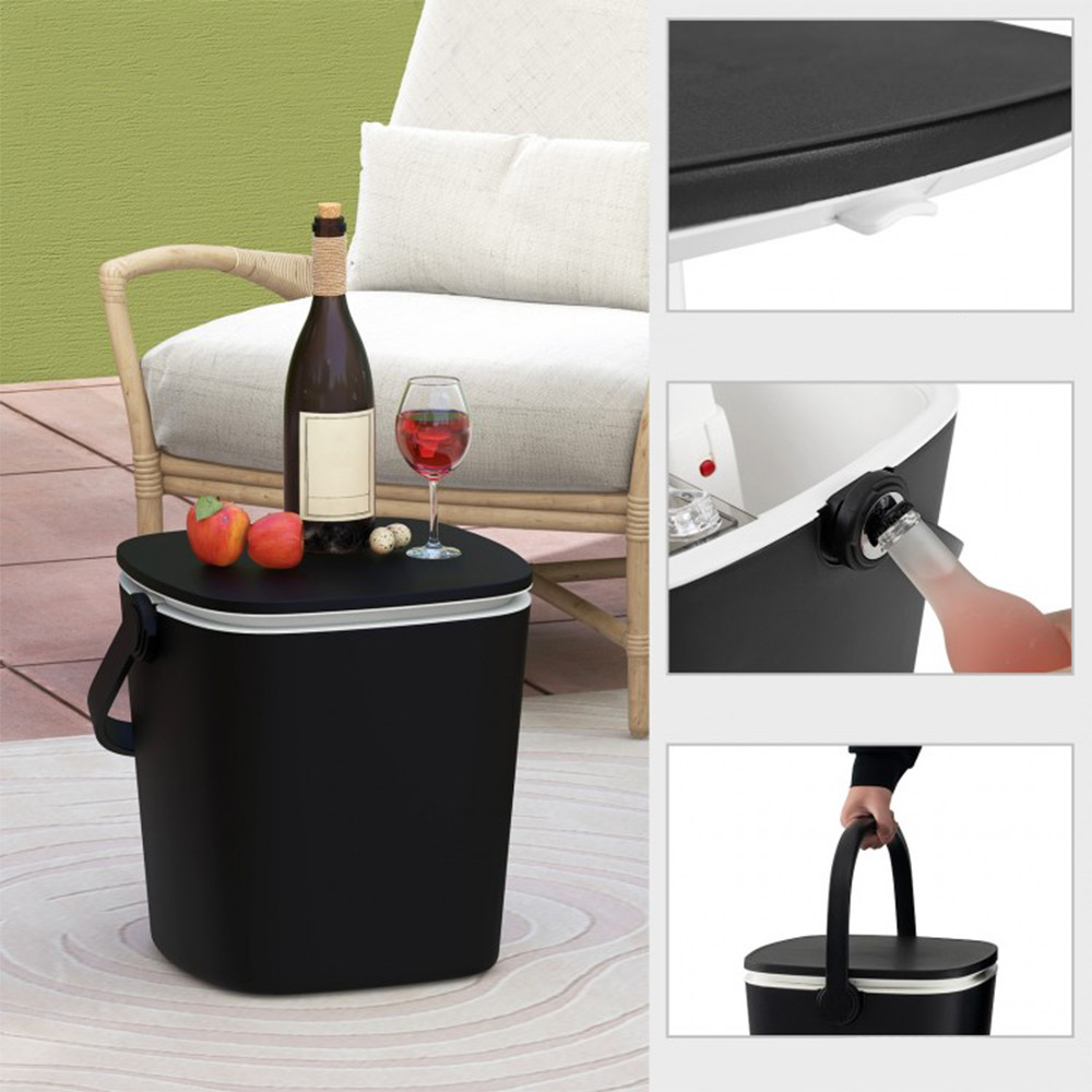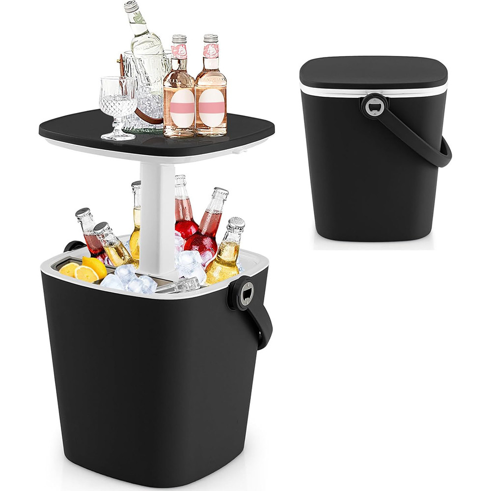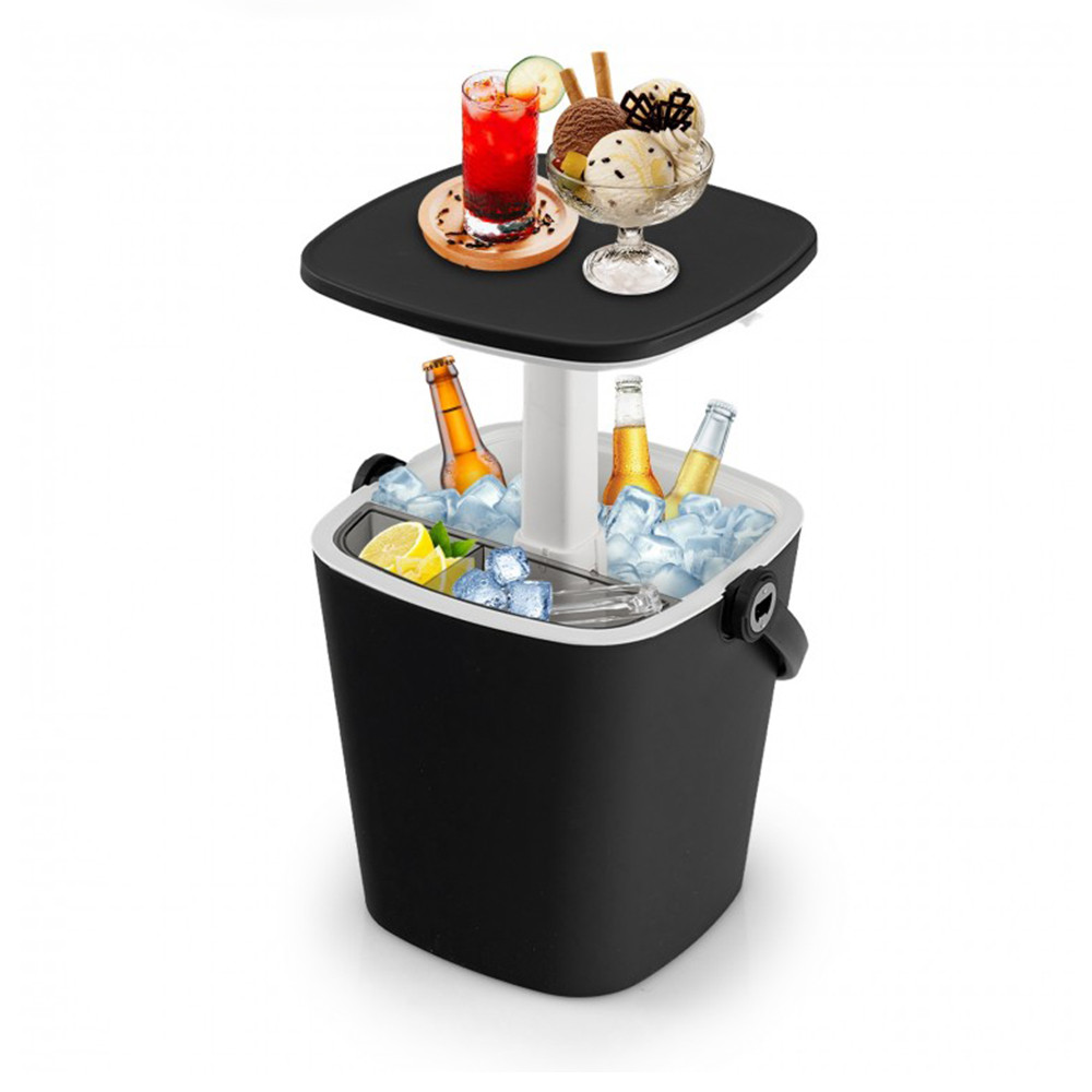 Ta 3-v-1 miza za hladilnik deluje kot hladilnik za led, koktajlna miza in praktična stranska miza hkrati. Dvignjena miza se lahko enostavno zaklene, kar vam omogoča hitro preklapljanje funkcij med uporabo.