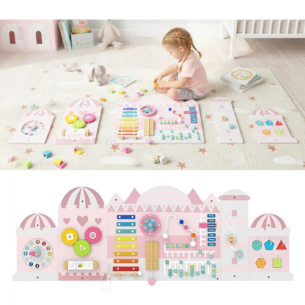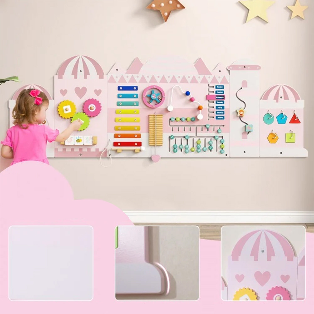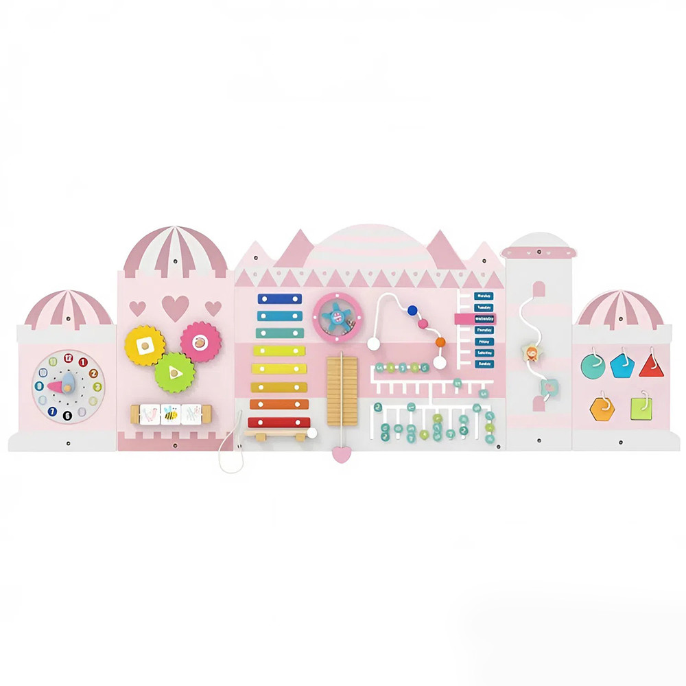 Lesena ura, abakus, drsni sedem, labirint, sortirnik oblik in ksilofon pomagajo pri razvoju zavedanja o času, štetju, logičnem razmišljanju in koordinaciji oko-roka. Risalna površina in rotacijski elementi ponujajo ustvarjalno samoizražanje in dolgotrajno angažiranost.