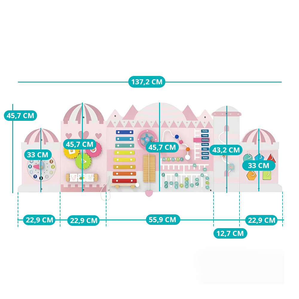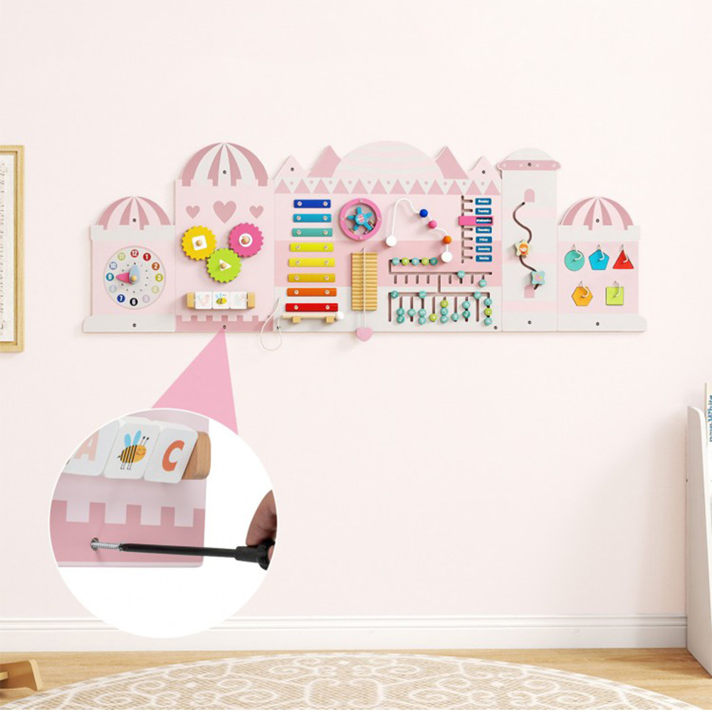 Interaktivna stenska tabla v obliki gradu vabi otroke, da raziskujejo z 11 različnimi igralnimi elementi. Rotacijske, drsne in taktilne funkcije omogočajo izkušnje učenja, hkrati pa naravno spodbujajo neodvisne poskuse.