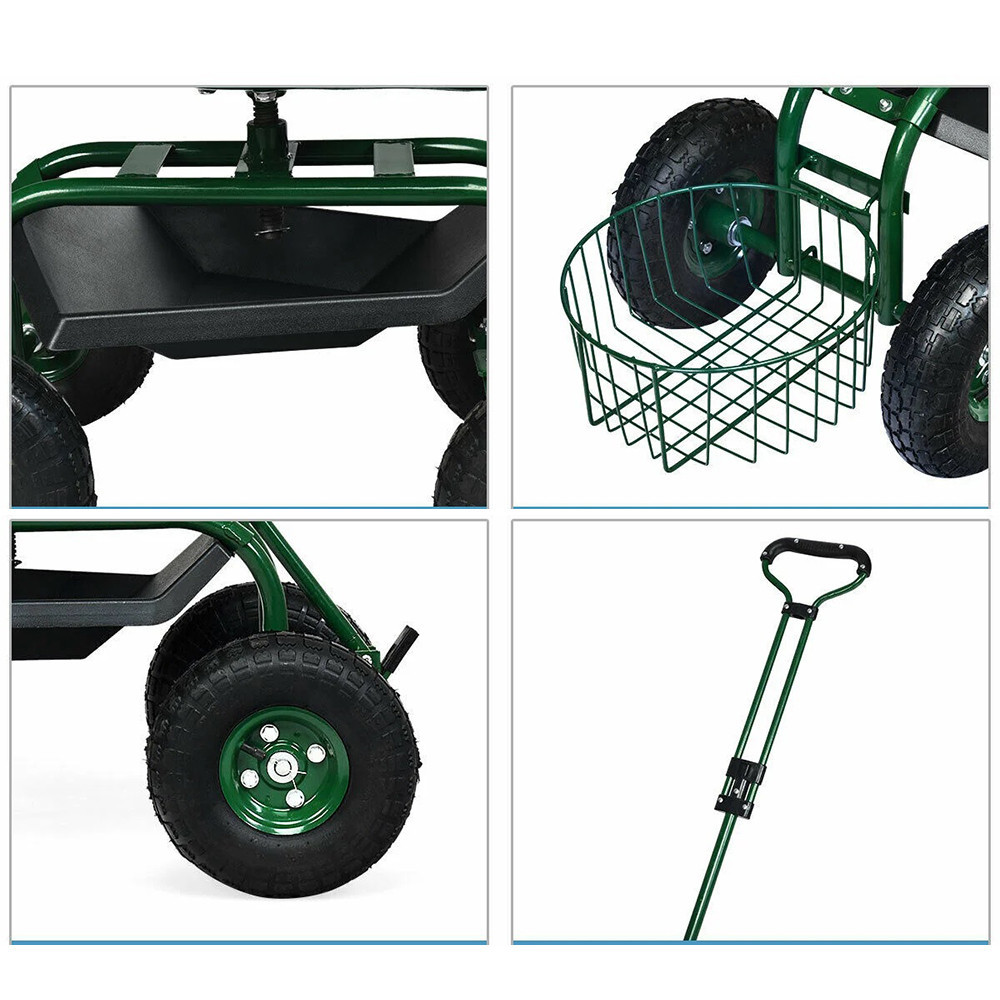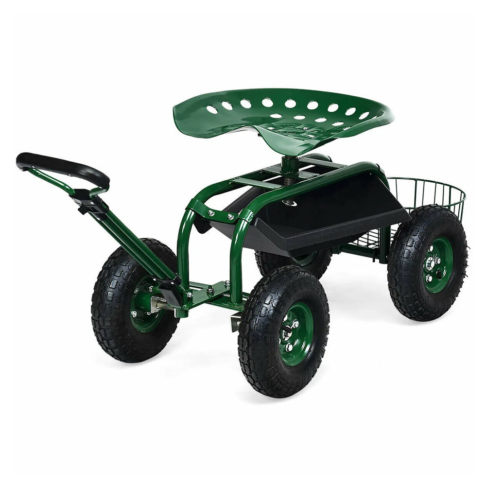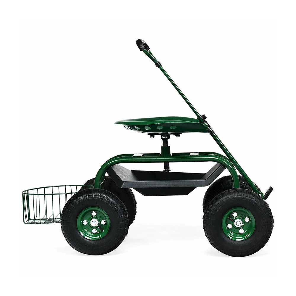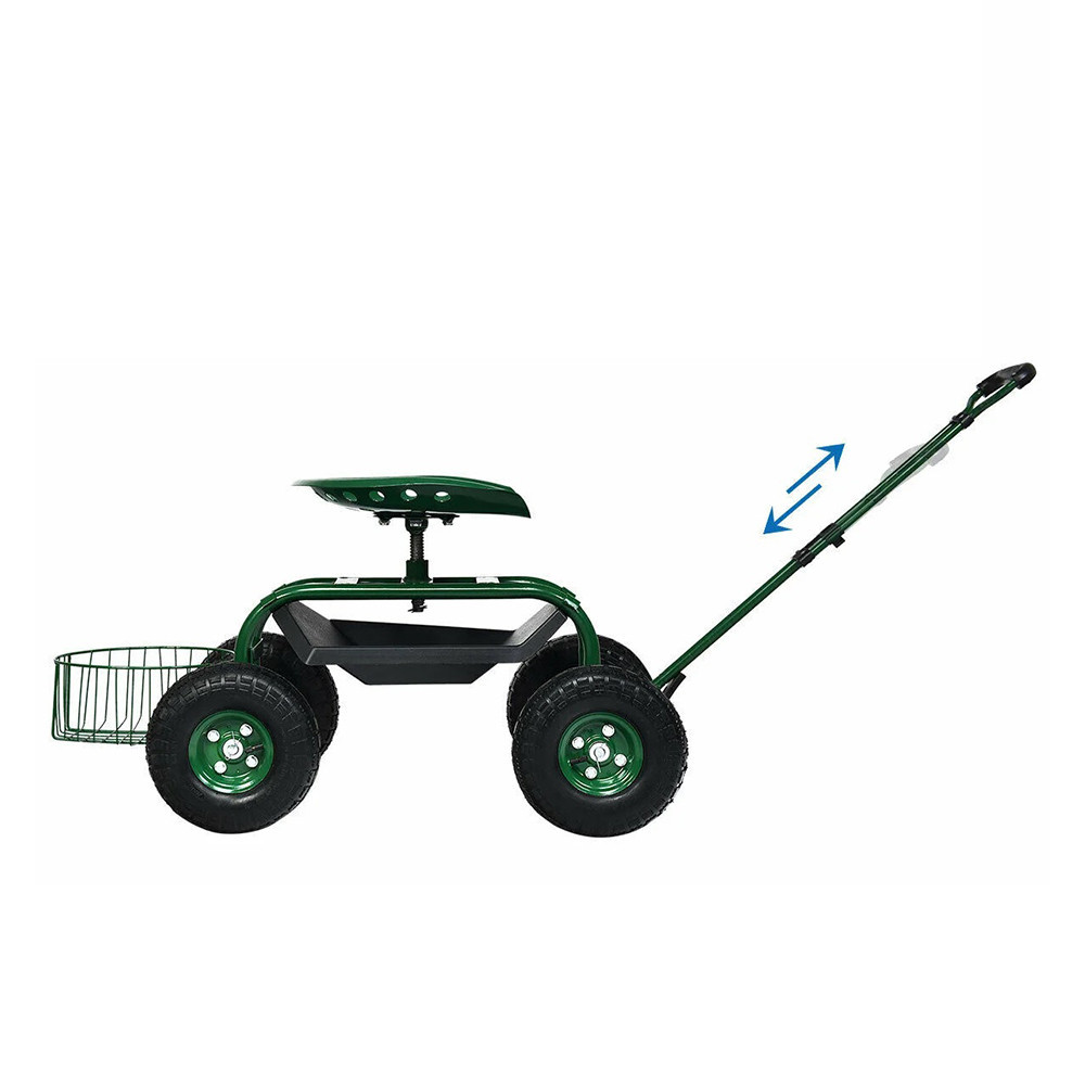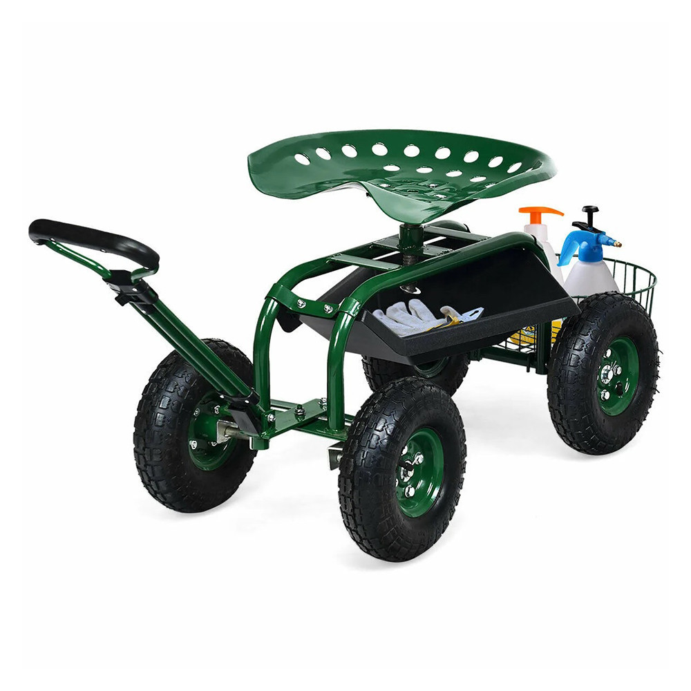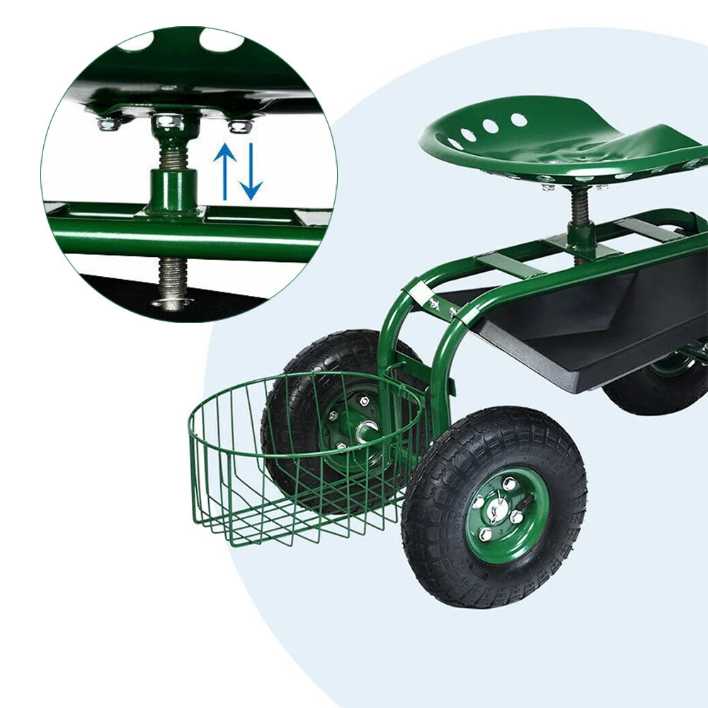 Vgrajene možnosti shranjevanja pomagajo ohranjati vaše orodje organizirano: zadnja žičnata košara lahko drži večje vrtnarske dodatke, medtem ko pladenj pod sedežem omogoča enostaven dostop do manjših ročnih orodij.