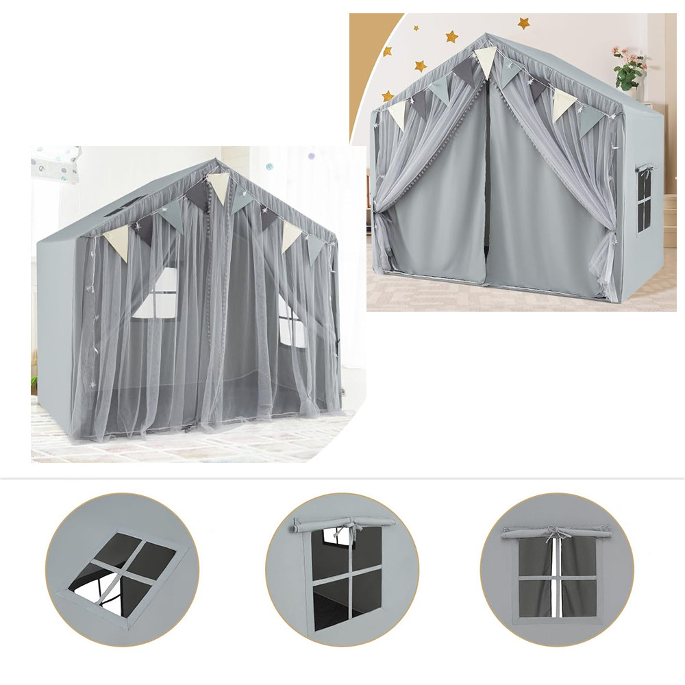 Zvezdne lučke in pisana zastavica ustvarjajo prijetno, pravljico podobno vzdušje, ki šotor še dodatno privlači. Mrežasta okna zagotavljajo ustrezno prezračevanje in varno vidljivost.