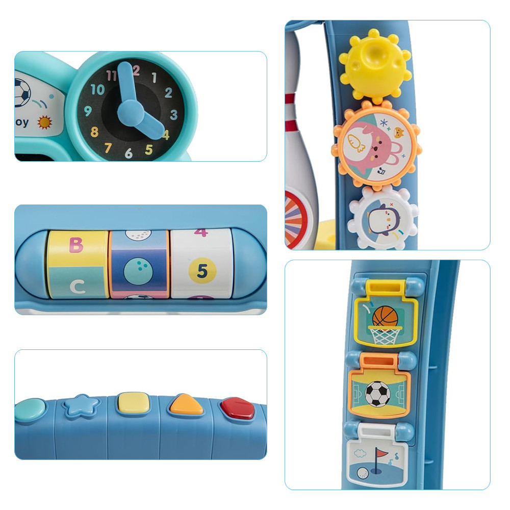 Vrteči zobniki, dvigljive kartice, ura in različne oblike nudijo priložnosti za učenje o številkah, črkah in vzorcih, kar izboljšuje miselne sposobnosti in koordinacijo oko-roka.